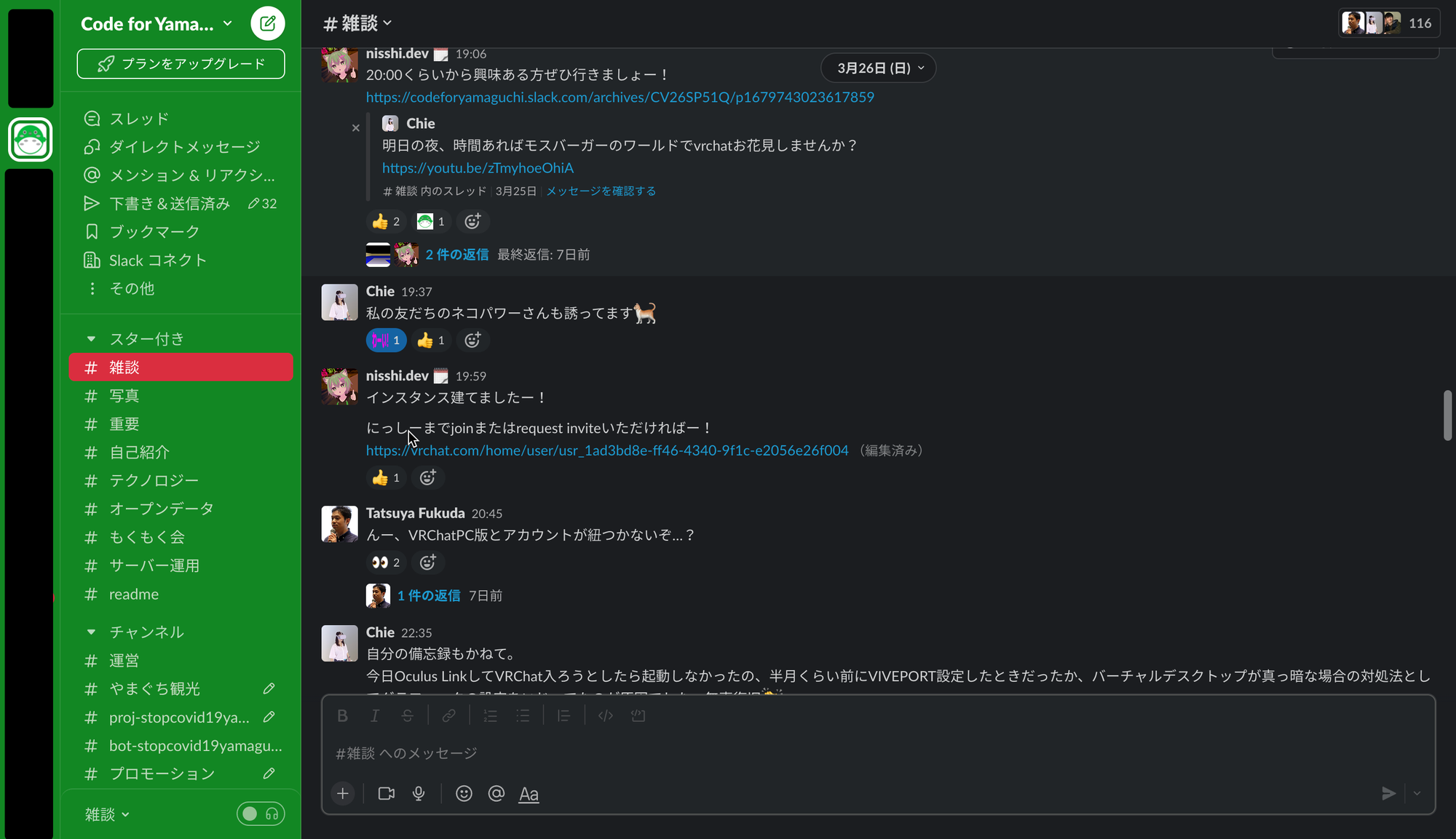 Code for Yamaguchiには、みんなでワイワイ楽しく何かに取り組んでいるメンバーが多く在籍しています。さまざまなスキルセットやスキルレベルを持つメンバーにより、楽しく議論できます。
